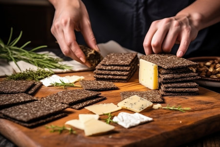 hand arranging rye crackers and cheese on a wooden boards, created with generative ai
