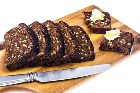 Enjoy a beautiful image of freshly sliced dark bread topped with butter, presenting a delicious meal option. Perfect for showcasing rustic cuisine in a kitchen setting.