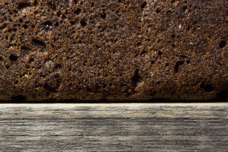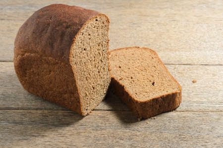 Black bread made of rye flour against the background of old village ash planks. Selective focus.