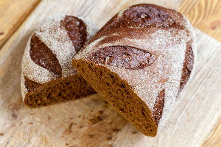 Two halves of black aromatic bread baked from rye flour. The loaf is cut into two halves during cooking. Photo close up