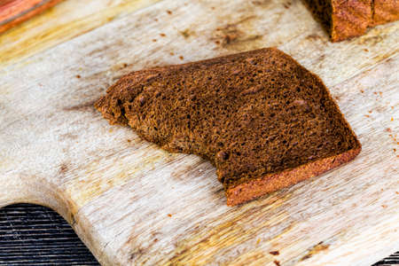 cut into pieces a loaf of black rye bread on a cutting Board, close-up of food in the village kitchen, on pieces of bread smeared butter