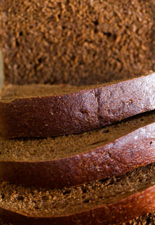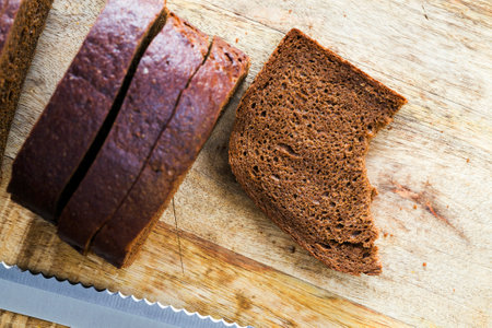sliced black rye bread loaf, close up on the table, one bit bitten