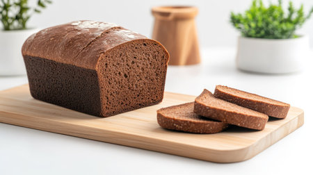 A delicious, rustic dark rye bread loaf, partially sliced, rests on a light wooden cutting board, showcasing its rich color and texture.