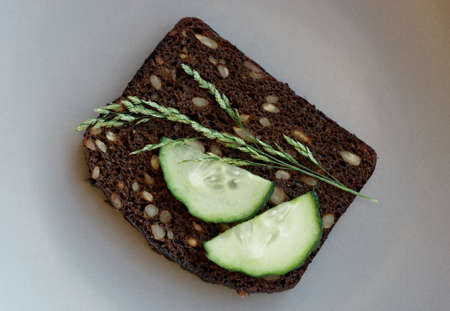 a slice of black grain bread on a gray background green garden cucumbers and straw