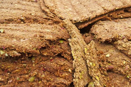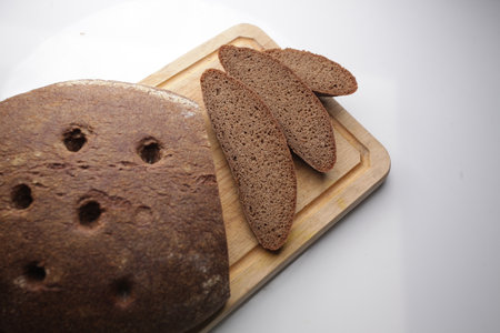 close-up of pumpernickel bread against white background, minimal shadow in front