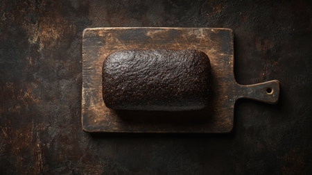 A beautifully crafted dark round buckwheat loaf sits on a rustic wooden board, showcasing its unique texture and inviting appearance, perfect for any culinary setting.