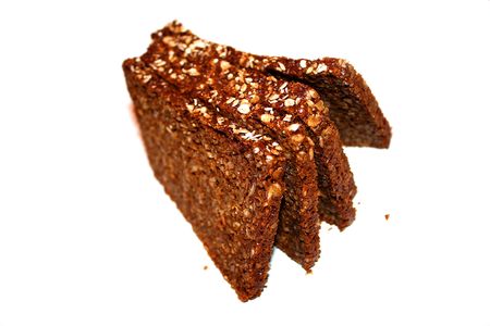 Slice of whole-grain dark bread, isolated on a white background close-up.