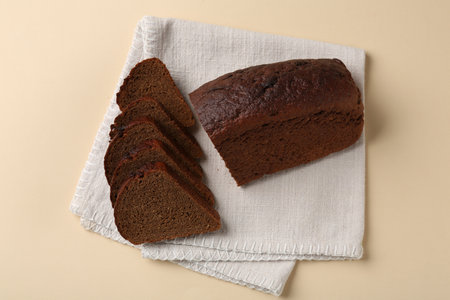 Rye bread, dark, fragrant, cut into thin round slices on a wooden background. Loaf of bread and rye ears still life on rustic background