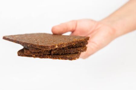 Stack of crunchy crispbreads laying on palm. Fresh crisps with cereals, oats and seeds isolated on white background. Studio shot. Selective focus. Side view. Homemade food and baking at home concept