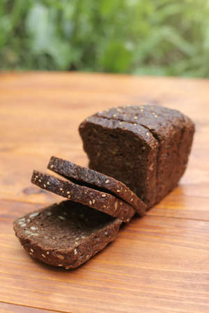 Grain bread sliced on a wooden table. Close-up, selective focus.