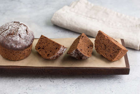 Chocolate cake on a dark brown board on a gray textured background. Delicious homemade food