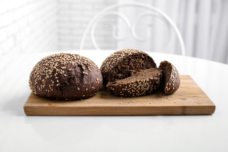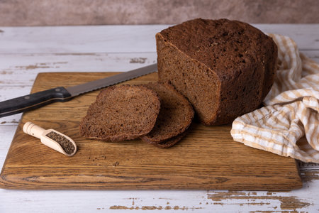 Sliced rye bread on cutting board. Whole grain rye bread with seeds.