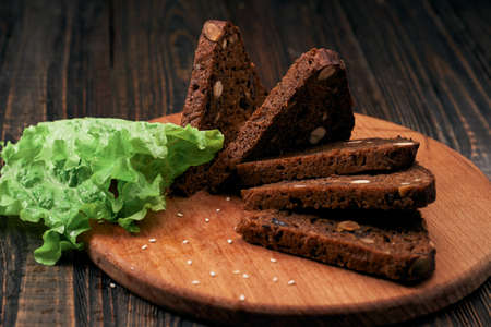 Lettuce leaves and rye bread with pine nuts on a wooden board.