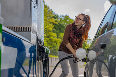 Pretty cute redheaded woman filling her car with gasoline on a petrol station. Happy woman refueling car looking at the machine.