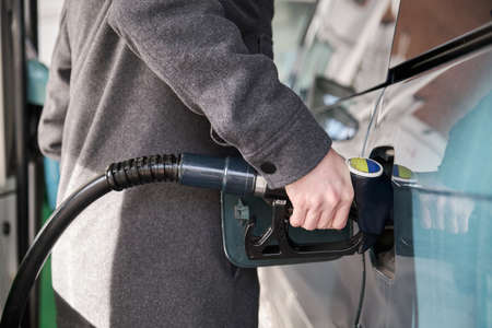 Male hand refilling the car with gas or petrol on filling station, holding a fuel pump outdoor