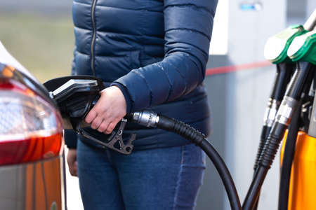 Female hand refueling car at gas station.