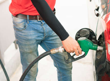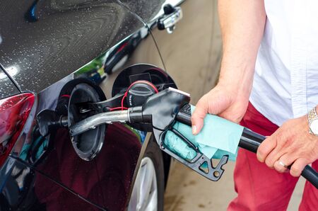 Male hand fill up petrol tank gasoline fuel petrol in car being filled with fuel at gas petrol station.