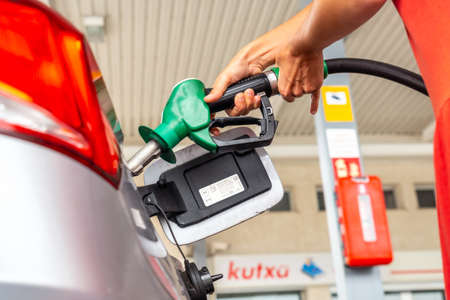 Refueling car. Pump gas at petrol fuel station. Gasoline oil nozzle tank from hand person. Automotive industry or transportation concept
