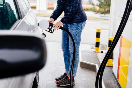Woman refueling her small silver car at the gasoline station