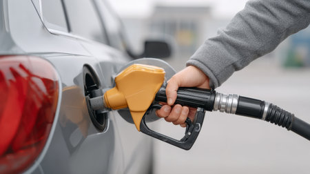 A close-up view of a person refueling a gray vehicle with a yellow fuel nozzle at a gas station. The image captures the act of filling the tank, showcasing daily routine life.