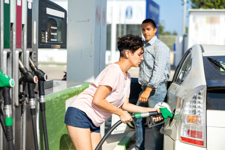 Attractive young woman refueling car at gas station. Female filling diesel at gasoline fuel in car using a fuel nozzle. Petrol concept. Side view