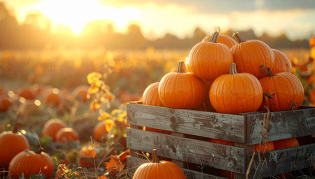 Golden sunlight bathes a pumpkin field during harvest time, creating a warm, inviting autumnal scene
