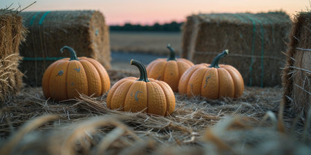 AI Generated. Pumpkins in Hay Bales at Dusk Creating a Harvest Time Feel