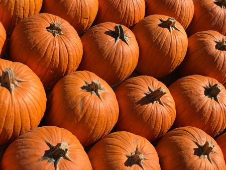 A full frame food background image of a stack of orange pumpkins for sale on a market stall for Halloween or pumpkin pie