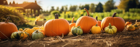 Pumpkin patch on sunny autumn day. Fall season landscape.