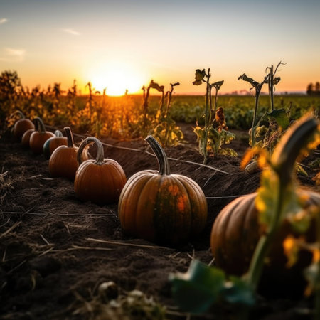 Harvest season brings vibrant pumpkins in a picturesque field at sunset
