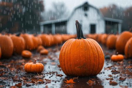 A field full of orange pumpkins in the rain. Generative AI image.