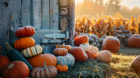Variety of pumpkins and gourds stacked by rustic farmhouse door, morning frost on grass. AI generative