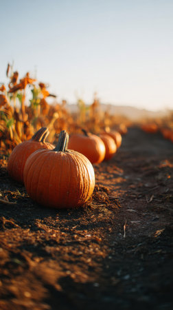 Bright orange pumpkins line the dirt path in a rural field during the golden hour, showcasing the spirit of autumn in a peaceful countryside setting.