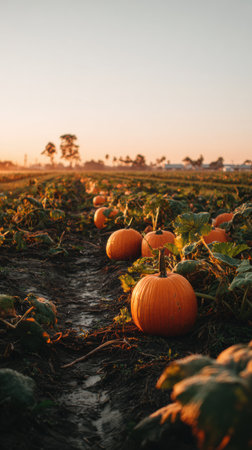 Fields filled with ripe pumpkins basking in warm sunset light, showcasing a tranquil autumn atmosphere with rows of greenery and distant trees.