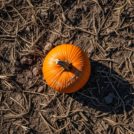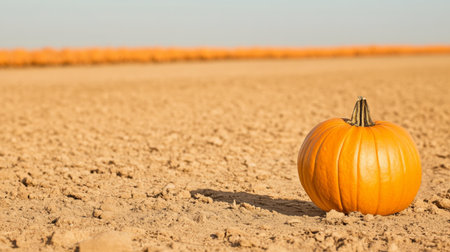 High-angle, top-down cinematic view of a single ripe pumpkin isolated in a dry, brown field under ha