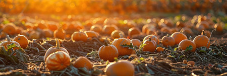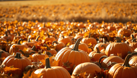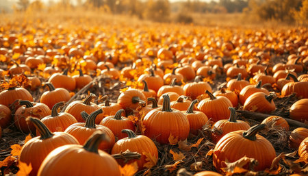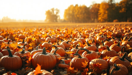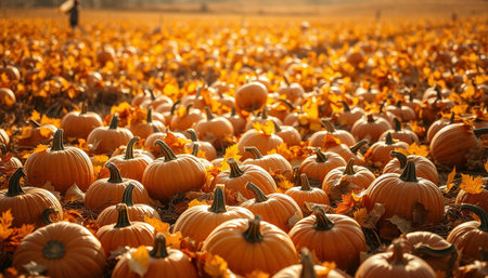 Golden sunlight bathes a pumpkin field during harvest time, creating a warm, inviting autumnal scene