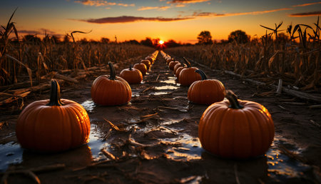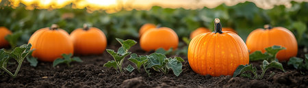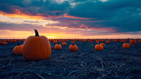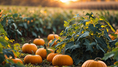 Harvest season brings vibrant pumpkins in a picturesque field at sunset