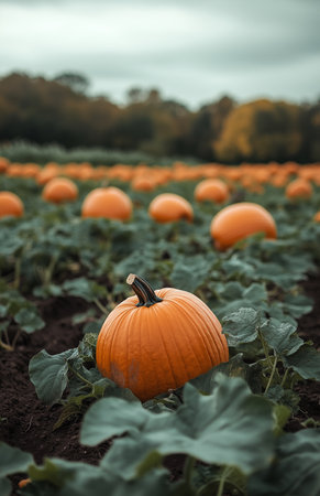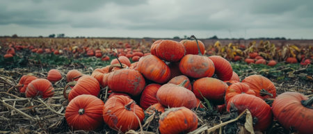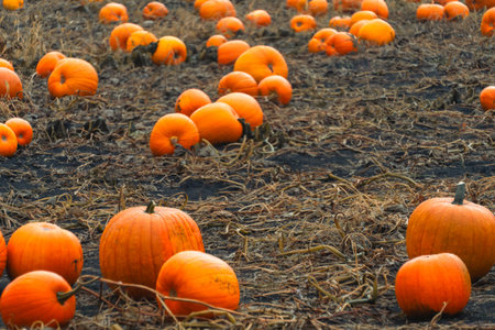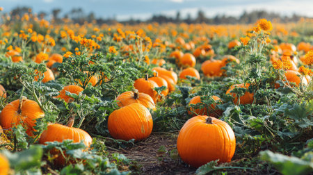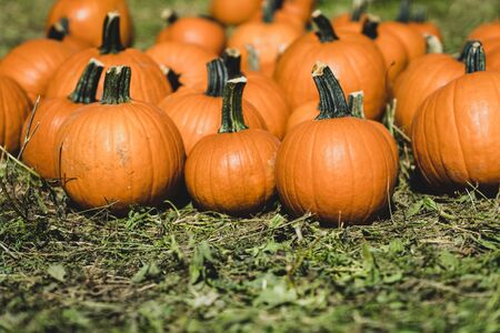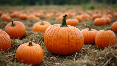 Bright orange pumpkins spread across a farm field in autumn, harvest season