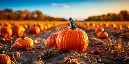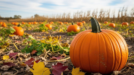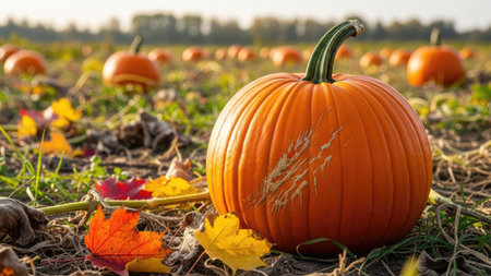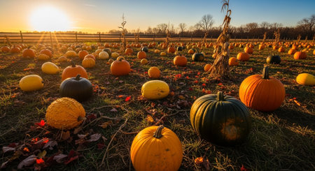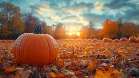 Pumpkin patch at sunset with vibrant autumn colors and scattered leaves in a scenic countryside setting. Generative AI