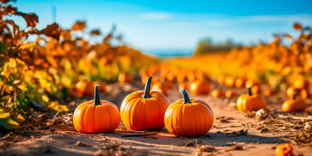 Pumpkin patch on sunny autumn day. Fall season landscape.
