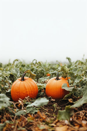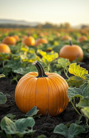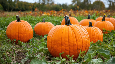 A Bright orange pumpkins in field surrounded by green leaves, ready for harvest, evoke sense of seasonal abundance