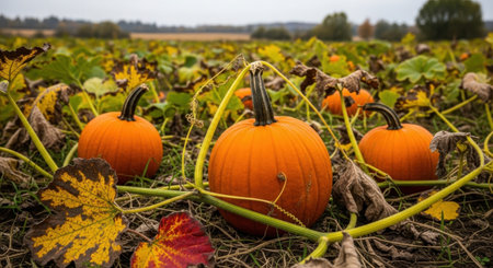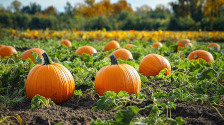 Pumpkins scattered across a farm field, thriving in a pumpkin patch, ready for harvest