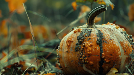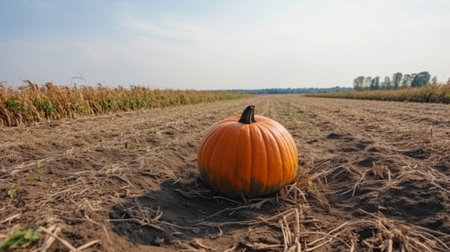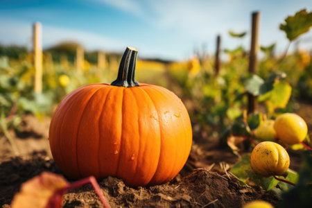 Fresh pumpkin in field. Autumn seasonal concept. AI generated.