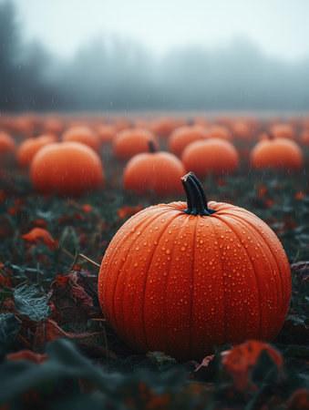 A field full of orange pumpkins in the rain. Generative AI image.