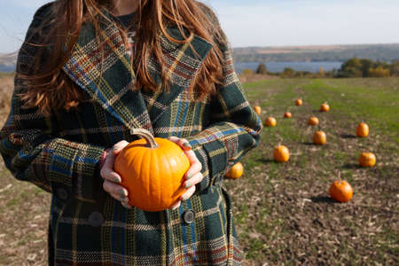 Halloween pumpkins on field at sunny autumn day. Harvest time