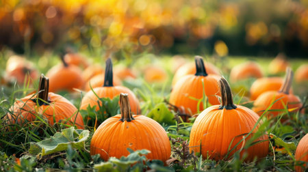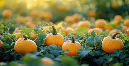 Bright orange pumpkins dot the ground in a lush field, surrounded by vibrant green leaves. The warm light of autumn adds a cheerful atmosphere to the harvest scene.