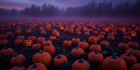 A hauntingly beautiful scene of a pumpkin patch adorned with glowing jack-o'-lanterns, set against a misty dusk backdrop, perfect for Halloween.