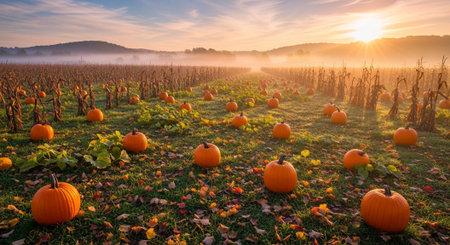 Pumpkin patch at sunrise. Beautiful autumn landscape with pumpkins.
