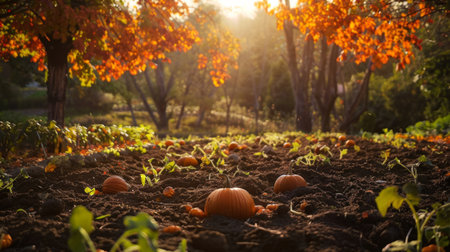 pumpkin seeds in a garden surrounded by trees with autumn colored leaves generative ai