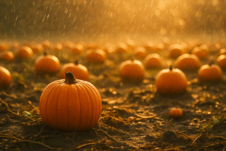 A vibrant pumpkin field in rain, illuminated by warm golden light during autumn season